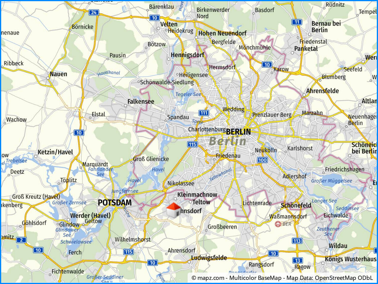 Südlich von Berlin gelegen, direkt angrenzend an Kleinmachnow sind es nur ca. 8 Minuten bis Berlin-Zehlendorf, ca. 20 Minuten zum Kurfürstendamm und etwa 15 Minuten bis in die Kulturhauptstadt Brandenburgs, nach Potsdam.