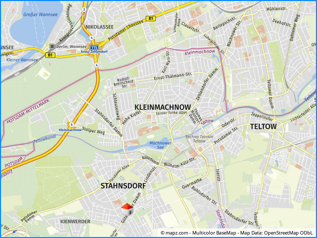Südlich von Berlin gelegen, direkt angrenzend an Kleinmachnow sind es nur ca. 8 Minuten bis Berlin-Zehlendorf, ca. 20 Minuten zum Kurfürstendamm und etwa 15 Minuten bis in die Kulturhauptstadt Brandenburgs, nach Potsdam.